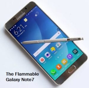Samsung’s Note 7 phones join a list of items banned on flights, ranging from the nonsensical, such as water (Water? WE are water.) to the ‘sensical’: fireworks and lighter fluid. Nobody knows how many flammable Note 7’s remain in circulation.